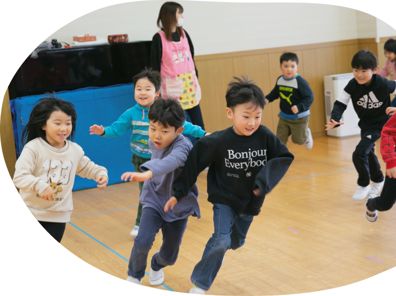 子どもたちの発達を支えるため、運動・英語・学研など多彩なプログラムを正課として実施。遊びの中で学び、創造力や協調性を育みます。