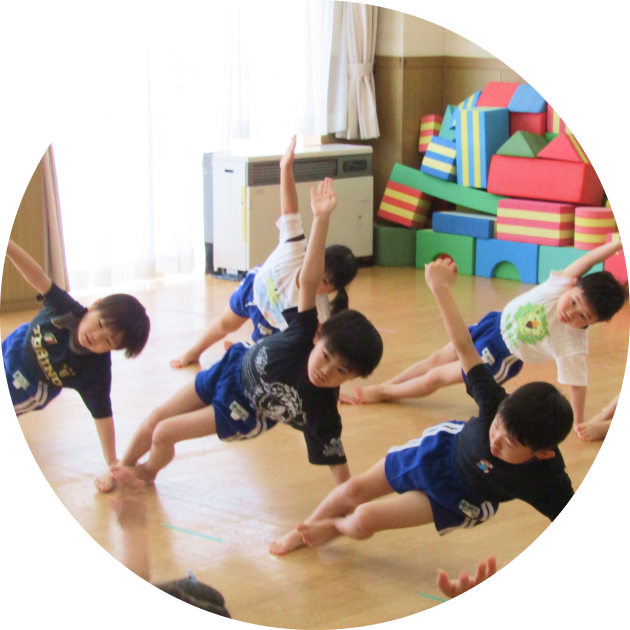 「マット運動」「鉄棒」「平均台」「跳び箱」「なわとび」などの全ての運動の基本になる体操を通じて体幹の強化を養います。元気いっぱい身体を動かすことにより、いつも健康で、笑顔でいられます。